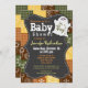 Autumn baby shower invitation for Halloween themed baby showers in October or fall months. Cute patchwork look background with green, brown, yellow, and orange gingham and paisley patterns. You can change the wording in the white cartoon ghost to read It's a Boy or It's a Girl! Images used on this item are licensed and © Graphics Factory.com