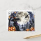 This Halloween postcard is ideal for black cat enthusiasts, showcasing a charming witchy cat amidst jack-o'-lanterns, a spooky tree, and bats. It is a delightful card for children or anyone who appreciates Halloween and the allure of black cats.