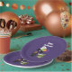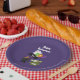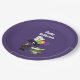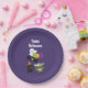 Paper plates with a black flying bat, a green mummy bat wearing white bandages and a cute black cat with an orange witches hat. Boo written in fun colourful letters with a happy ghost floating behind. Purple background.