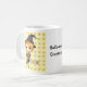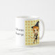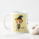 Cute Halloween chibi witch and her black kitty are riding on a broom against a candy corn background on a mug, with the words "Halloween Greetings" on it. Customisable so you can change mug styles and text.