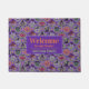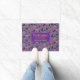 This Halloween doormat has a cute knitted sweater pattern is based off of the theme of classic Fair Isle knitted designs. The pattern is of purple and green circles and diamond stripes. Each shape has a different cute Halloween motifs in it. You have black cat with a moon, Frankenstein’s head, happy jack o’ lantern pumpkin, skull with red eye raven, witches hat with feet, grave yard with ghosts, vampire lips/teeth with bats, and a picketed fence yard with a fall tree the moon with a bat. In-between the designs are candy corn, wrapped candy and a diamond design. On top is an area that says Welcome to our home and the family. Personalise this with your own greeting and family name.