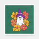 Fun Halloween design featuring a ghost wearing a witch's hat surrounded by a wreath of orange and yellow flowers