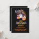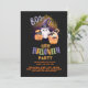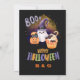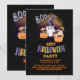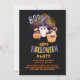 This customisable stylish Halloween party invitation features a smiling ghost with a purple witch hat, an orange pumpkin with a cat, and a festive cupcake topped with bats andsweets, all set against a deep black background. Bright orange and purple accents pop vividly against the dark backdrop, creating a perfect mix of spooky and playful. Finished with a decorative monogram at the bottom, this design is ideal for sending unique and cheerful Halloween party Invitations.