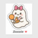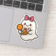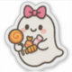 Cute halloween ghost with pink bow, holding trick or treat candy.