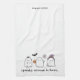 Elevate your Halloween home decor with this cute kitchen towel with a friendly ghost trio, bat, and spider. Phrase is customizable and towel can be persoanlized with a name/family name/custom text on other end of towel. White background.