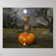 An orange tabby cat uses a cat-faced jack o' lantern to try to reach flying bats.