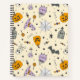 This cute Halloween pattern features a delightful mix of spooky and sweet illustrations scattered across a light beige background. The design includes playful Halloween elements such as a purple witch's hat adorned with stars, pumpkin-shaped candy, whimsical skulls and bones, and lollipops. Additional spooky touches include spiders hanging from webs, bats, tombstones, and potion bottles labelled "Magic." Small stars and polka dots fill the gaps, giving the design a cheerful and fun vibe. The soft colour palette, including purples, oranges, and yellows, adds to the charm, making this pattern perfect for a lighthearted Halloween celebration.