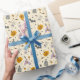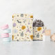 This cute Halloween pattern features a delightful mix of spooky and sweet illustrations scattered across a light beige background. The design includes playful Halloween elements such as a purple witch's hat adorned with stars, pumpkin-shaped candy, whimsical skulls and bones, and lollipops. Additional spooky touches include spiders hanging from webs, bats, tombstones, and potion bottles labelled "Magic." Small stars and polka dots fill the gaps, giving the design a cheerful and fun vibe. The soft colour palette, including purples, oranges, and yellows, adds to the charm, making this pattern perfect for a lighthearted Halloween celebration.