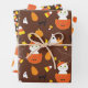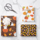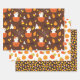Collection of three cute colourful Halloween patterns with cats, pumpkins, candy corns and ghosts decorated with stars and spiderweb