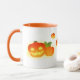 This Halloween themed orange combo mug features cute smiling carved pumpkins in different sizes.