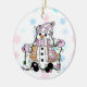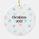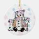 Cartoon snowman holding Christmas lights in pink and blue and snowflakes background holiday ornament keepsake, personalised on the back with the year or your own personal message.