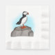 Birthday, baby shower or anniversary napkins. Digital art hand drawn Puffin standing on a rock with blue background.