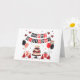 Cute happy birthday ladybug theme. Red, black and white design with balloons, paper hats, gift boxes and cake.