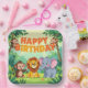 Cute Happy Birthday safari theme with monkeys, lion and elephant in the jungle.