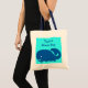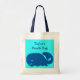 Cute Blue Whale Beach Bag Custom Name Tote bag. Features a cute cartoon blue whale with his tail curved up and a smile on his face, with his bottom on the waves. On a aqua, sea blue background. Customise with the name, change wording or delete to leave plain. You can choose your handle colour on some bags.
