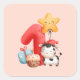 Stickers with an adorable image featuring a smiling cow, with a gold star balloon and some cake and a present.