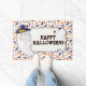 Festive Halloween doormat featuring a smiling ghost in a witch hat with a bold “Happy Halloween!” message. Surrounded by a whimsical border of pumpkins, bats, and autumn leaves, this playful design makes a fun seasonal accent for porches, entryways, or party spaces. A cheerful way to greet trick-or-treaters and guests.