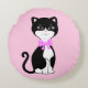 Cute Happy Tuxedo Cat on Light Pink Round Cushion