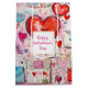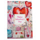 Gift bag with a whimsical pattern. Scrapbook style doodles and scribbles. Red and pink hearts and various letters and envelopes scattered all around.