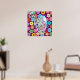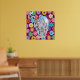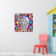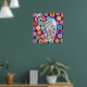 A bright colorful elephant decorated with hippie flowers and on a bright flower purple background. Cute kids elephant smiling with it's trunk up. "elephants" "hippie elephant" "elephant with flowers" "floral print" "Cartoon elephant" "kids" "smiling elephant" "cute" "hippy" "girly" "purple flowers" "colorful" "bright" "pretty"