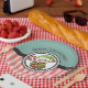 Paper plates with a cute Christmas elf in a festive green outfit holding onto a red and white striped candy cane. The background is a layered design with pastel green on the top and red stripes on the bottom. Separated by a strip of black with a chalkboard texture. Merry Christmas written with curved text.