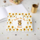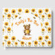 A cute teddy bear dressed like a honey bee. Two bees fly above the text against a background of pretty brown-centred yellow flowers. All text can easily be changed to your information.