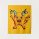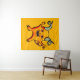 Cute demon kids tapestry with a fun cartoon ink drawing of a yellow weird demon creature with horns smiling happily and showing its sharp teeth over warm yellow background, great for kids.