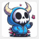 "Introducing Butterfly Bliss: Cute Horned Skull, delighting in butterflies while wearing a blue hoodie. This design combines whimsy, nature, and cosy charm in a unique and adorable way."