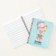 Spiral notebook with an adorable design featuring a watercolor illustration. A hot air balloon decorated wuth pretty red and pink flowers. A cute little white baby bear sits in the basket. Light blue background.