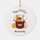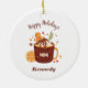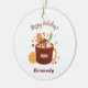 This festive and heartwarming ornament features a smiling gingerbread cookie relaxing in a brown cup of hot chocolate, paired with the cheerful greeting “Happy Holidays.” Set in a cosy holiday theme with warm tones and whimsical charm, this design can be customised with your name or a loved one’s—making it perfect for gifting, holiday cheer, or personalised seasonal fun.