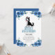 This baby shower invitation features a thematic, professional layout designed with a balanced blue and white color palette. The aesthetic combines traditional floral elements with a playful, illustrated mascot a stylized husky puppy positioned at the center to establish a warm, welcoming tone.