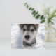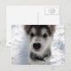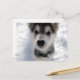 This post card has an adorable colour photo of a husky puppy standing in the snow.