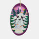 A fun Oval Ornament, with two cute Penguins having fun, ice-skating, in a snowy landscape with fir trees and a setting sun; from a hand-painted paper collage by Judy Adamson.