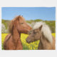 Two Icelandic horses standing side by side, nibbling their heads, in a yellow flowering field of rapeseed on a sunny day in front of blue sky in spring, a chestnut and a silver dapple coloured pony. A cute pony photo taken by Katho Menden, this fleece blanket is an enchanting gift idea for horse lovers.