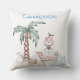 This custom throw pillow features a cute pirate theme. An image of a pirate ship is pictured at the bottom, sailing near an island with a treasure chest and gold. A little seagull is pictured standing on the island, and a message in a bottle is seen floating in the sea. A sample name is printed above of the image which you can personalise to include your own custom name or other text.
