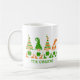 Cute personalised mug featuring four funny Irish gnomes clad in orange, green and shamrocks. Add your name in green Celtic typography.