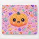 Sweeten your workspace with this irresistibly cute Halloween mousepad! A round, smiling jack-o’-lantern sits at the centre, its big black eyes sparkling with star-shaped pupils and rosy pink cheeks adding extra charm. Surrounded on all sides by colourful Halloween candy, the playful design pops against a soft pink background. Perfect for fans of kawaii art, Halloween treats, and cheerful spooky vibes.