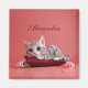 A cute grey and white cartoon tabby cat lays on a garnet-coloured pillow with pink carnations nearby.