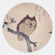 A reproduction of an old Japanese woodblock print of a cute "smiling" owl sitting on a branch. The vintage image has been carefully selected, colour corrected, spot cleaned, retouched, cropped and prepared for printing at the highest quality.