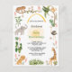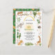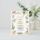 Front is framed with numerous jungle animals, plants, and flowers. Reverses to jungle green with allover animal pattern. birthday event is backed with sunflower sun and topped with archway of golden yellow watercolor. Colours are jungle green, sunny yellow, golden brown, and soft grey.