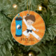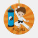 Personalised & Dated Cute brunette boy Karate personalised Christmas Ornament set on an orange background. Visit our shop to view this adorable karate boy in a variety of hair & poses.