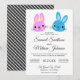 Amaze your guests with this cool wedding invitation featuring cute bunnies with modern typography against a white background. Simply add your event details on this easy-to-use template to make it a one-of-a-kind invitation. Flip the card over to reveal a grey and white stripes pattern on the back of the card.