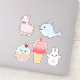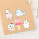 Cartoon themed sheet of stickers with cute Kawaii style characters like a llama, whale, rabbit, cupcake and an ice cream cone.