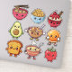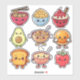 Adorable Kawaii food stickers. This sheet includes a cute bowl of ramen noodles with chopsticks, a blue bowl of mac n cheese, a red bowl of vanilla ice cream with a cherry on top, an avocado, a bowl of cereal, a pancake, a piece of toast, a bowl of soup and a strawberry.