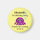 A cute little cartoon illustration of a purple jellyfish with pink spots and big kawaii eyes, some little blue water bubbles hovering over her head. Set on a light yellow background. Personalise / customise with your own party details.