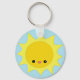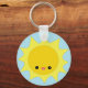 A cute keychain with a fun baby kawaii sun smiling down from a blue sky.