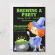 A cute, red-headed witch, dressed in purple from her tippy hat to her kicky boot slippers (except for her striped socks) holds a spoon above a cauldron boiling with green bubbles. Her black cat looks on in approval. At her feet and the feet of the round, metallic pot are colourful mushrooms. The background, front and back, is black. An interesting "Eyeballs" font has been selected for the most prominent lines of type, all in a bright green to match the witch's brew. For RSVP, we have used "Regrets Only". However, if you want a different RSVP, there is room for an extra line or two. Just as there is room, on the back, for directions to your venue if you feel your guests can use the help. Also on the back, our adorable witch is riding her broom in the night sky above a couple of jack o'lanterns.