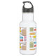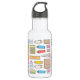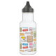 A water bottle with cute doodles of school supplies which include calculator, pencil, crayons, notebook, scissors, eraser, glue etc. Great for kids for school!