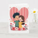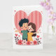 This greeting card shows a joyful scene of young love, centered on a smiling boy and girl standing side by side. The boy has dark spiky hair and wears a green shirt, while the girl has long brown hair and a bright yellow dress. Their happy expressions and rosy cheeks give the scene a warm, cheerful feeling. Behind them is a large striped heart in soft pink and coral tones, stitched together like a symbol of care and devotion. Smaller red and pink hearts float around them, adding energy and affection. Along the bottom, a row of delicate flowers in shades of crimson and pastel pink with green leaves adds beauty and balance. Every detail works together to create a sweet and heartfelt card, perfect for sharing Valentine’s Day love.