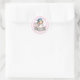 A cheerful kindergarten graduation design featuring a smiling child in a blue cap standing in front of a pastel pink school bus, surrounded by a circular border with celebratory text. Soft colors and playful artwork make it perfect for stickers and envelope seals celebrating this special milestone.